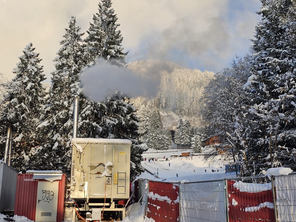 Voici le CAD du Villars Alpine Resort, installé près du collège et dont les fumées se dispersent vers la piste de luge. Ici on voit les émissions de la chaudière à gaz, les deux cheminées noircies à gauche de la photo, seraient des chaudières à bois, actuellement à l’arrêt car plus autorisées par le canton. Pourtant RE a tout racheté ….