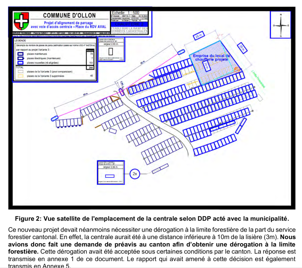 Pour ce qui concerne les arbres censés masquer la vue de la cheminée de 23m (totalement irréguliere selon les plans d’affectation en vigueur), ils vont être abattus, laissant surgir la cheminée avec son panache en continu. Le projet prévoit d’abattre des arbres se trouvant actuellement en aire forestière, et en faisant fi des limites de construction dans la bande de 10 mètres de la forêt.
